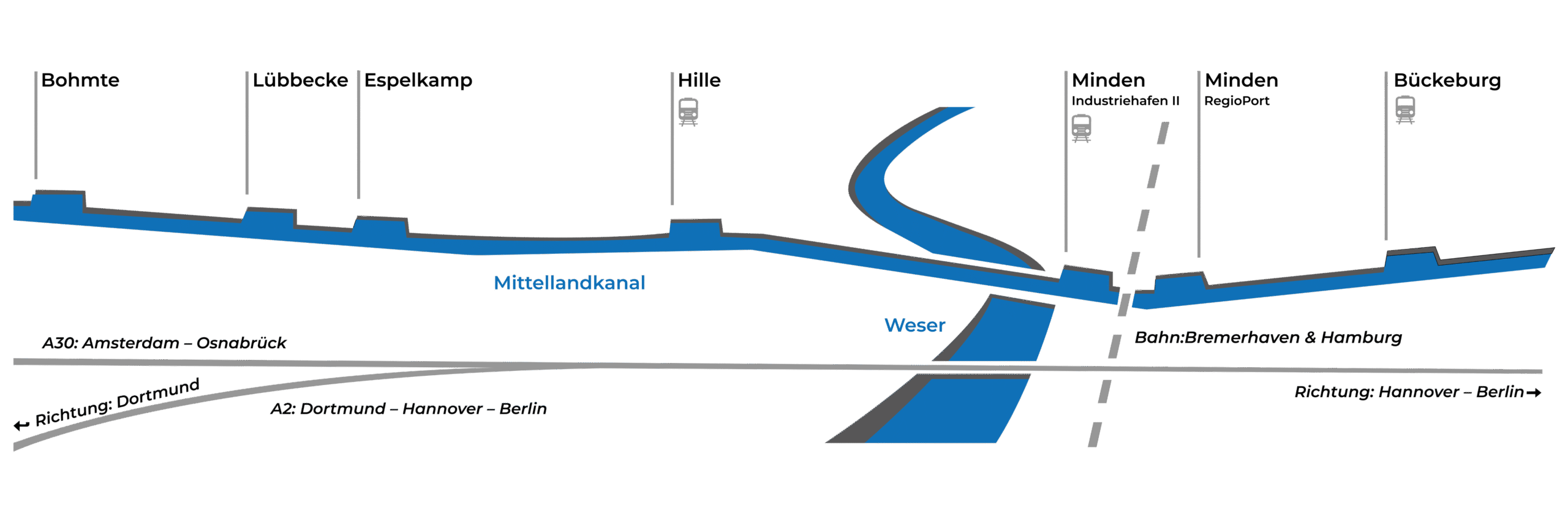 Das Hafenband am Mittellandkanal verbindet sechs Standorte in Ostwestfalen-Lippe und Niedersachsen.